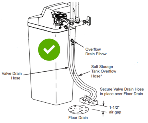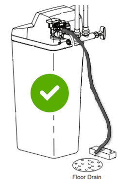 - To ensure your softener can drain freely, you need to have an air gap of 1 ½ inches between the end of the drain hose and the drain itself, as shown: