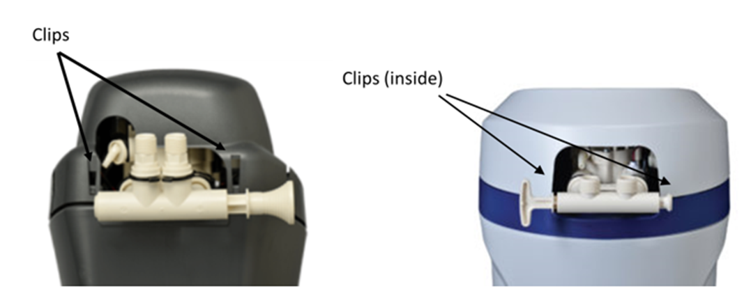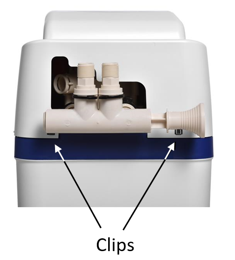 On the back of the unit, unhook the two clips that hold the cover onto the tank below (see photo). Flex/pull the cover out and away from the softener at these clips.