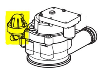 3. Locate the nozzle & venturi assembly on the left-hand side of softener's valve head. The venturi has a gray plastic base with a white dome-shaped cap (pictured below).