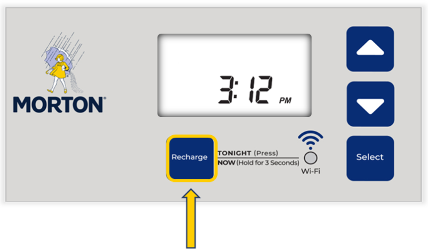 2. Now you'll depressurize your unit by running a Recharge cycle. Hold the Recharge button until you hear the motor start to spin, and then release. You'll see ‘Recharge Now’ or ‘Recharging’ flashing on the screen.